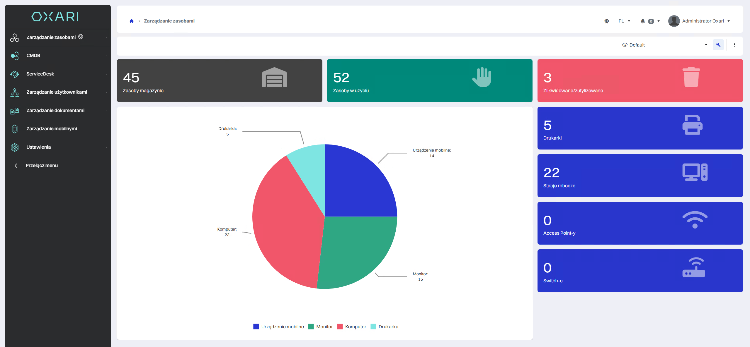 Rozbudowany system OXARI Asset Management służy do kompleksowej ewidencji zasobów IT, zgodny z ITIL i w pełni zintegrowany z modułami CMDB i ServiceDesk. Upraszcza nie tylko inwentaryzację sprzętu komputerowego, ale także zarządzanie dowolnymi aktywami – od urządzeń biurowych po aparaturę medyczną. Istotną przewagą na rynku lokalnym jest polskojęzyczny support oraz wdrożeniowcy działający w języku polskim, co usprawnia komunikację, przyspiesza rozwiązywanie problemów i ułatwia adopcję systemu w organizacji – szczególnie w zespołach, które preferują pracę w języku polskim. System automatyzuje procesy obiegu sprzętu i pozwala tworzyć własne typy kapitałów oraz raporty.